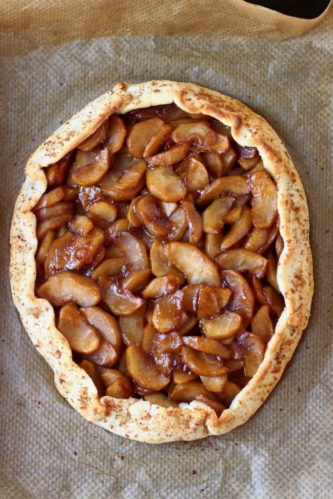 This Gluten-Free Vegan Apple Galette is loaded with sweet, juicy, salted caramel-flavoured apples, subtly spiced with toasty cinnamon and enveloped in a crispy, flaky pastry crust!