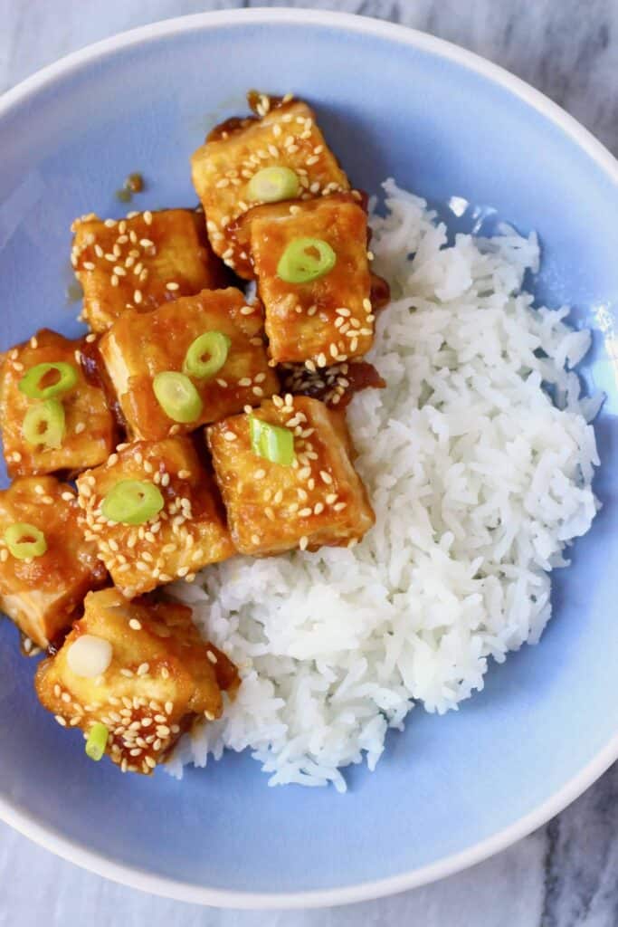 Photo of rice and several pieces of fried tofu sprinkled with sesame seeds and sliced spring onions on a blue plate